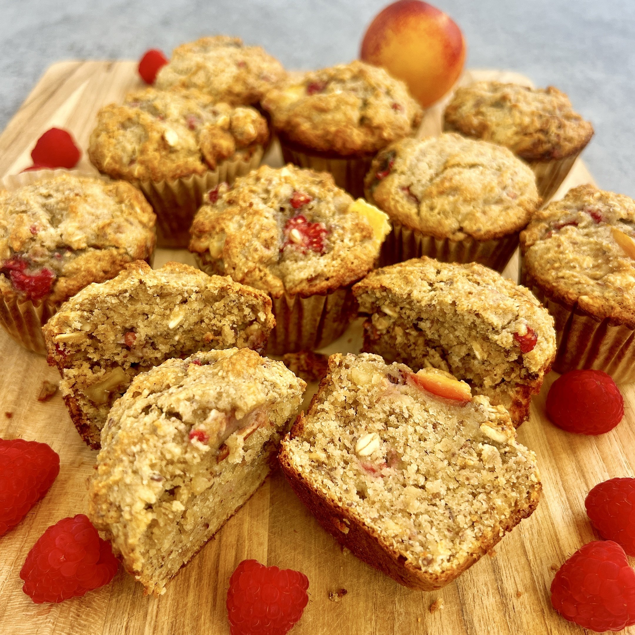 These are a welcome to summer kind of muffin. Almond flour base sweetened with honey, nectarines, and raspberries. They can me made quickly in one bowl , so that is a plus. These are not grain-free, so if you are following a grain-free diet, these are not for you. Check out my Blueberry Banana Muffins or Cinnamon Apple Walnut Bars instead. We recently introduced oats into our diet and have been incorporating some oat flour into our baking - in addition to almond flour - this recipe uses both. These only make 10 muffins so they go quickly - doubling this recipe would be a good idea!