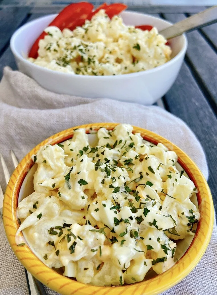 Grandma’s famous potato salad has always been something we love. My daughter and I decided to try swapping the potatoes for cauliflower while still using all the ingredients that make her potato salad so tasty. No skimping on the mustard, mayo and hard-boiled, this worked for us. Super yummy and filling, but not as heavy as the real deal. We debated roasting the cauliflower but landed on steaming it, so we could end up with firm in-tact cauliflower pieces.