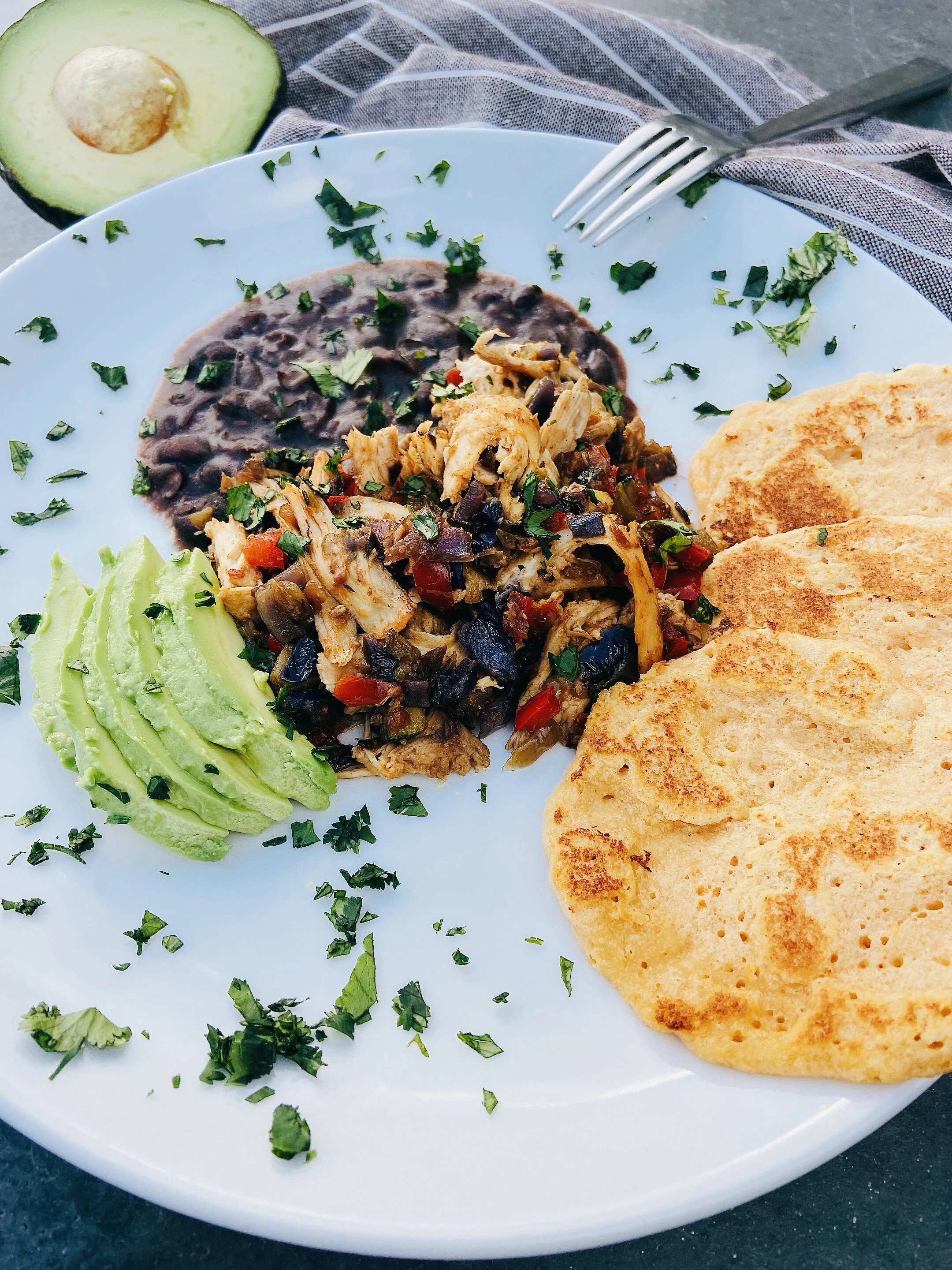 This is a great meal to make with leftover roast chicken! We serve it with avocado and red lentil tortillas. I love this meal because it is something I can do quickly with leftovers - chicken that has already been roasted and beans that have already been cooked.
