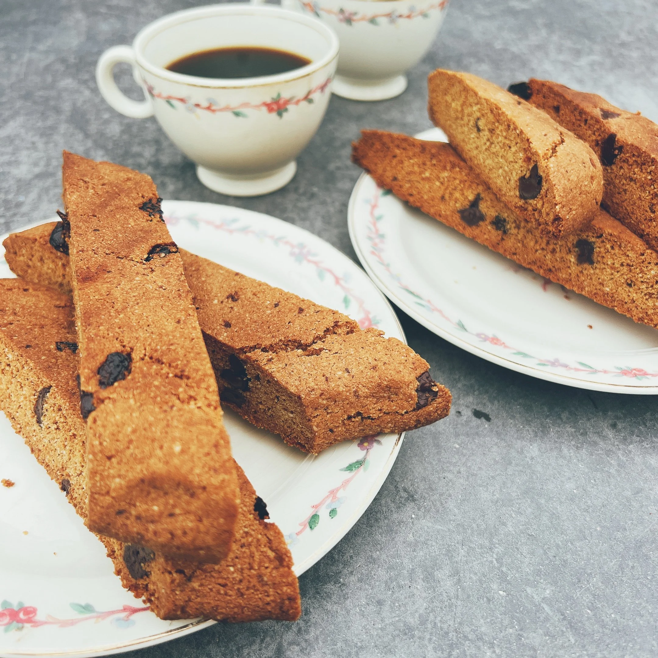 These are what you want for a lazy breakfast or take a breath, have a cup of coffee (or tea) moment. They seem daunting with the bake twice thing - but they aren’t. Super easy and sweetened with and dried (no-sugar added) fruit. We also use date sweetened chocolate chips - by Hu company - these are modified SCD.. We used unsweetened dried cherries (thank you Trader Joe’s). These are great with dried apricots and walnuts too.