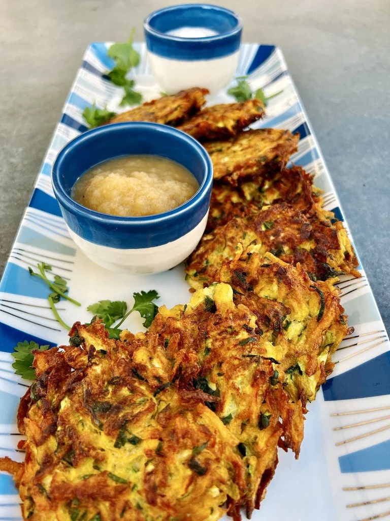 We are big fans of potato latkes, but I also wanted to make a veggie version so we could indulge all 8 nights of Hanukkah! Kabocha squash (the round squash with dark green skin) is kind of magic - it is starchy like a sweet potato so holds together well. You can also substitute with butternut squash if you can’t find kabocha squash. This will make about 8 latkes.