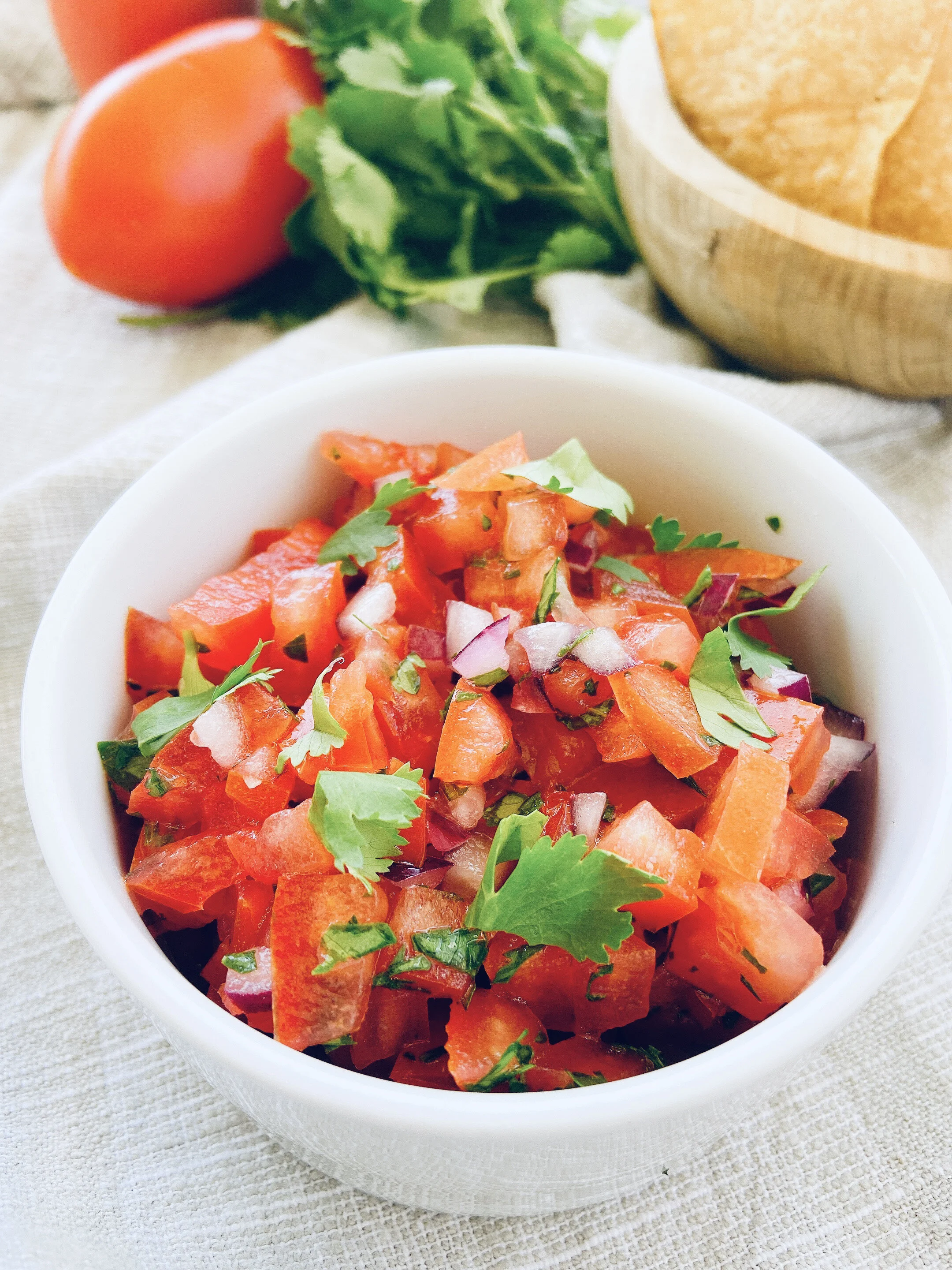 When tomatoes are in season, this is often on the table! The lime salt combo is what makes this salsa so addicting. Everyone (except for my tomato-hating teen) eats this on pretty much everything. We, of course, eat this with chips, but it is also wonderful in an avocado boat, on top of roasted veggies or on scrambled eggs. There are so many different ways to enjoy this. We use Roma or simple tomatoes on the vine.