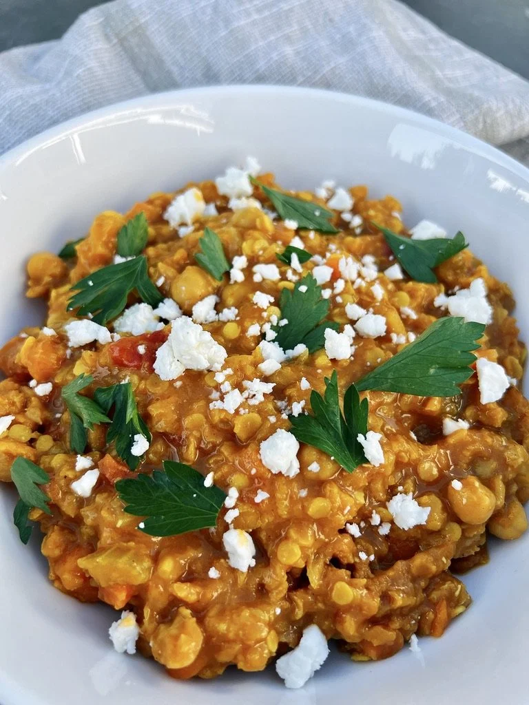 This is a hearty and veggie packed stew that is sure to fill you up on a cold day. It makes great leftovers and is perfect for thermos lunches. Our meat eaters in the family top it with a sugar-and additive free sausage — a sprinkling of feta is also lovely as well.
