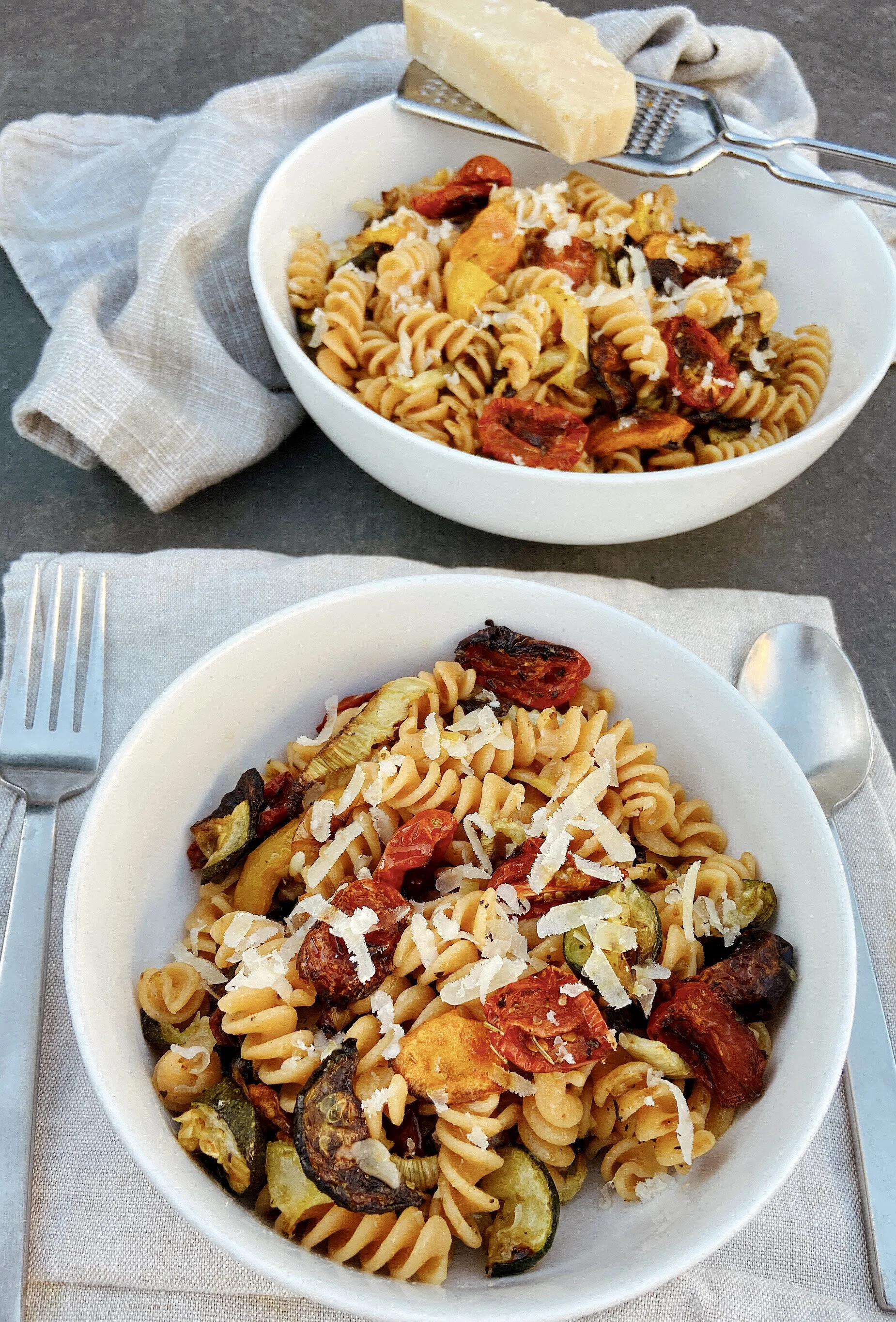 Drain your pasta and toss immediately with 1TBSP extra virgin olive oil and 2 TBSP salted butter. Mix in all your roasted veggies straight from the pan, making sure to include the browned bits and oil drippings.
